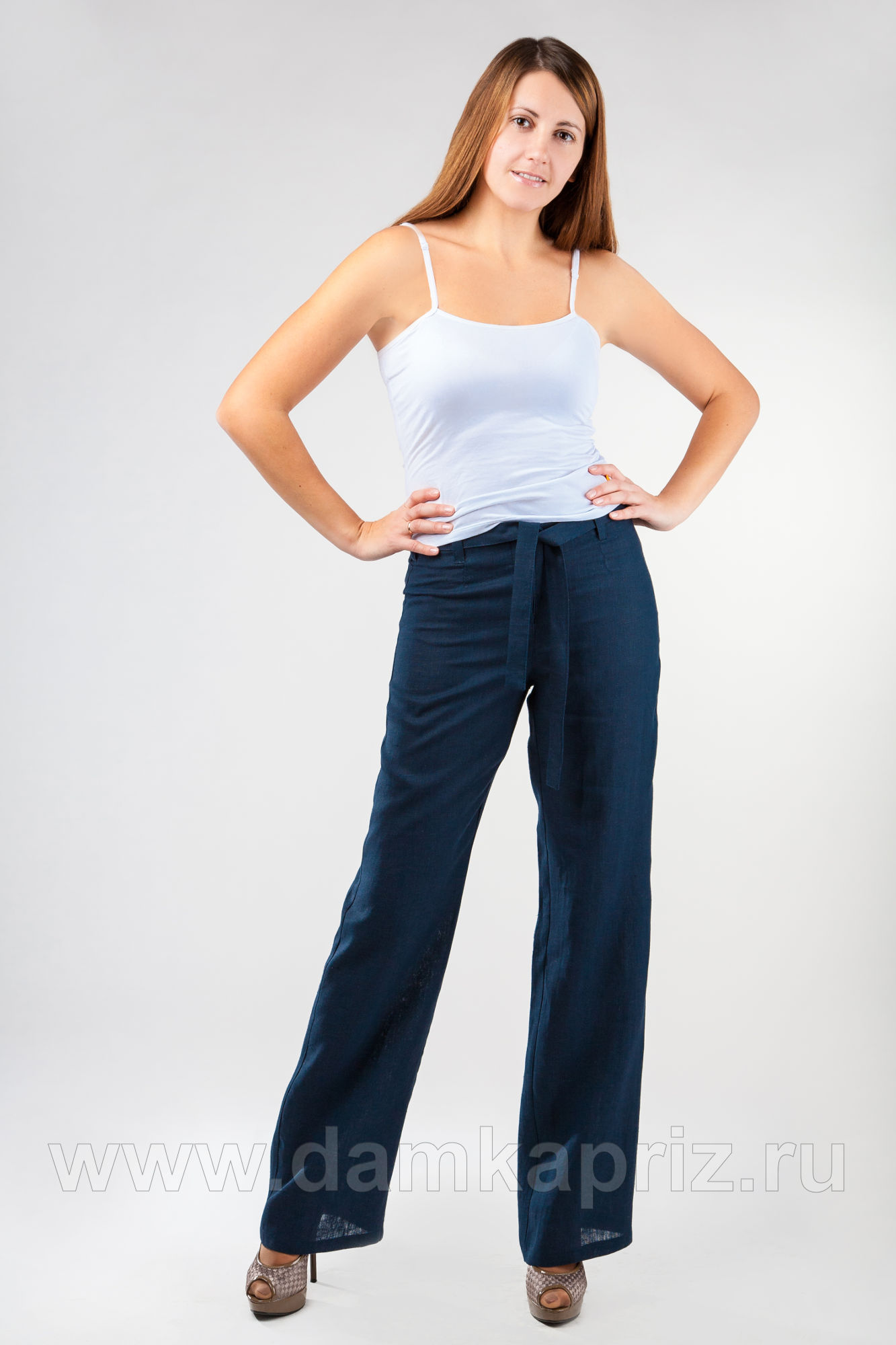 Брюки прямые, с заниженной линией талии. Верхний срез обработан обтачками. Шлевки выполнены на выточках и боковых швах. Завязывающийся пояс выполнен из основной ткани.