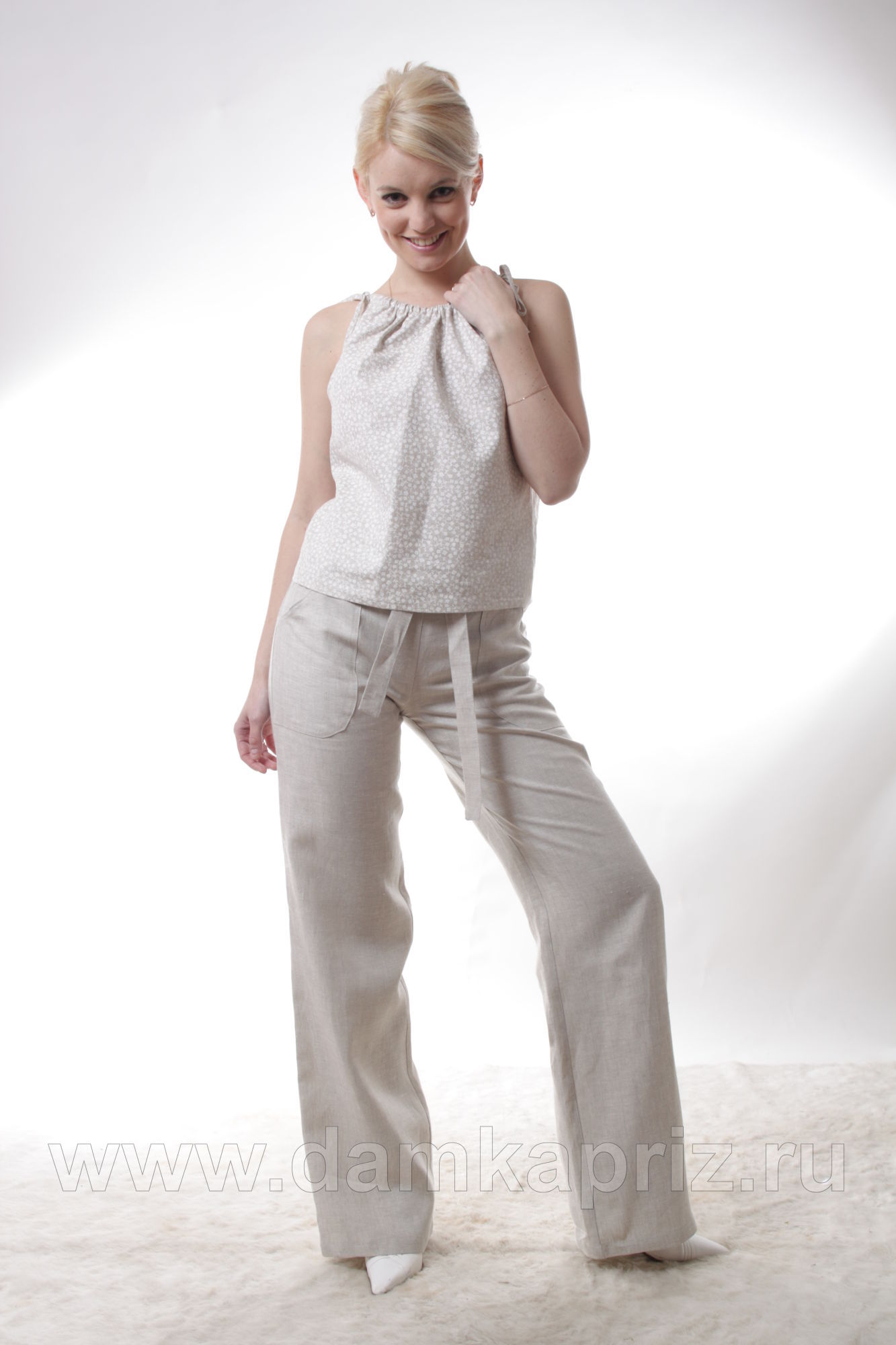 Брюки прямые на поясе с резинкой. Накладные карманы на передних половинках имеют наклонный вход и шлевки закрепленные на поясе. Завязывающийся пояс выполнен из основной ткани.