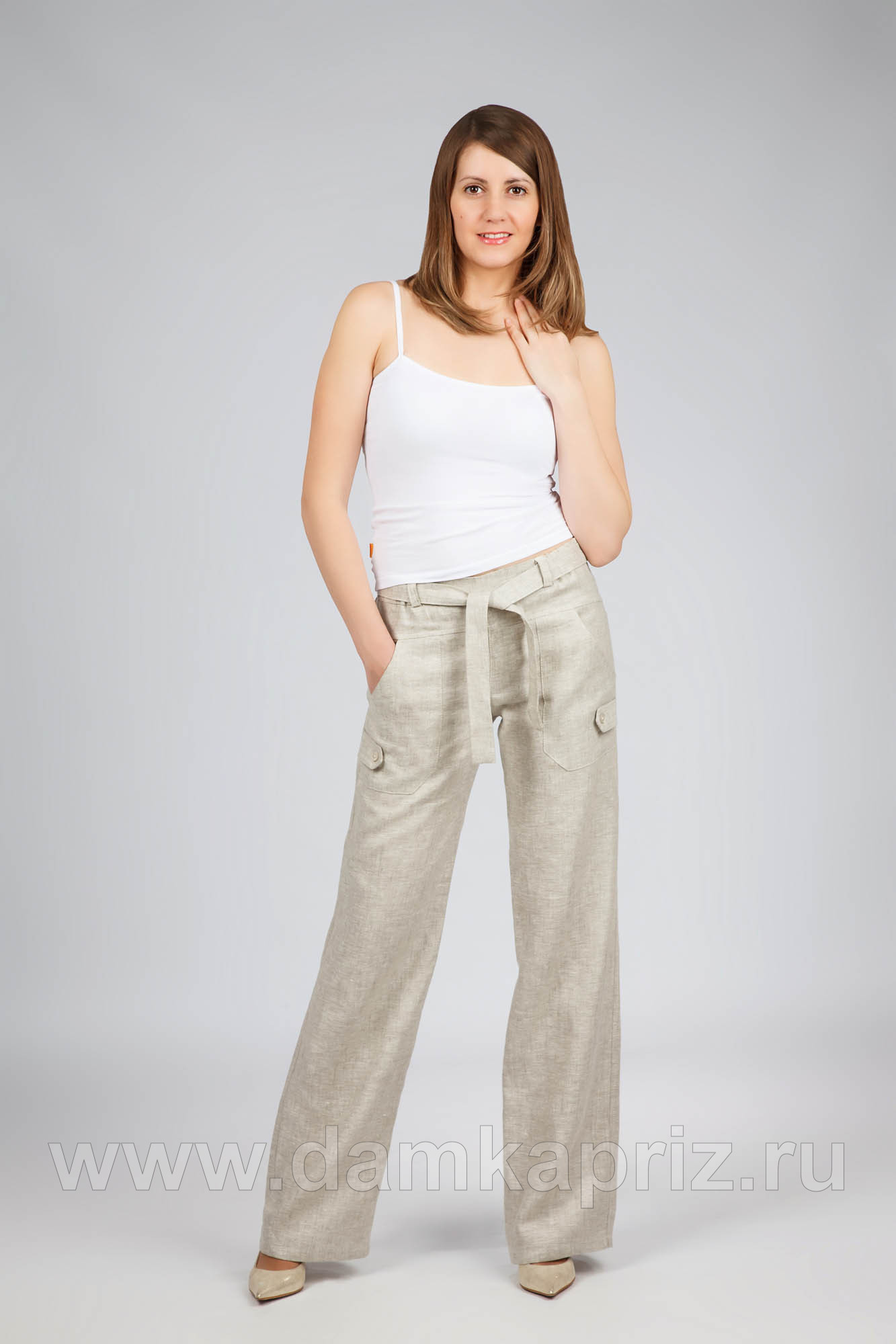 Брюки прямые на поясе с резинкой. Накладные карманы на передних половинках брюк с декоративными шлёвками. На задних половинках - клапаны. Завязывающийся пояс выполнен из основной ткани.