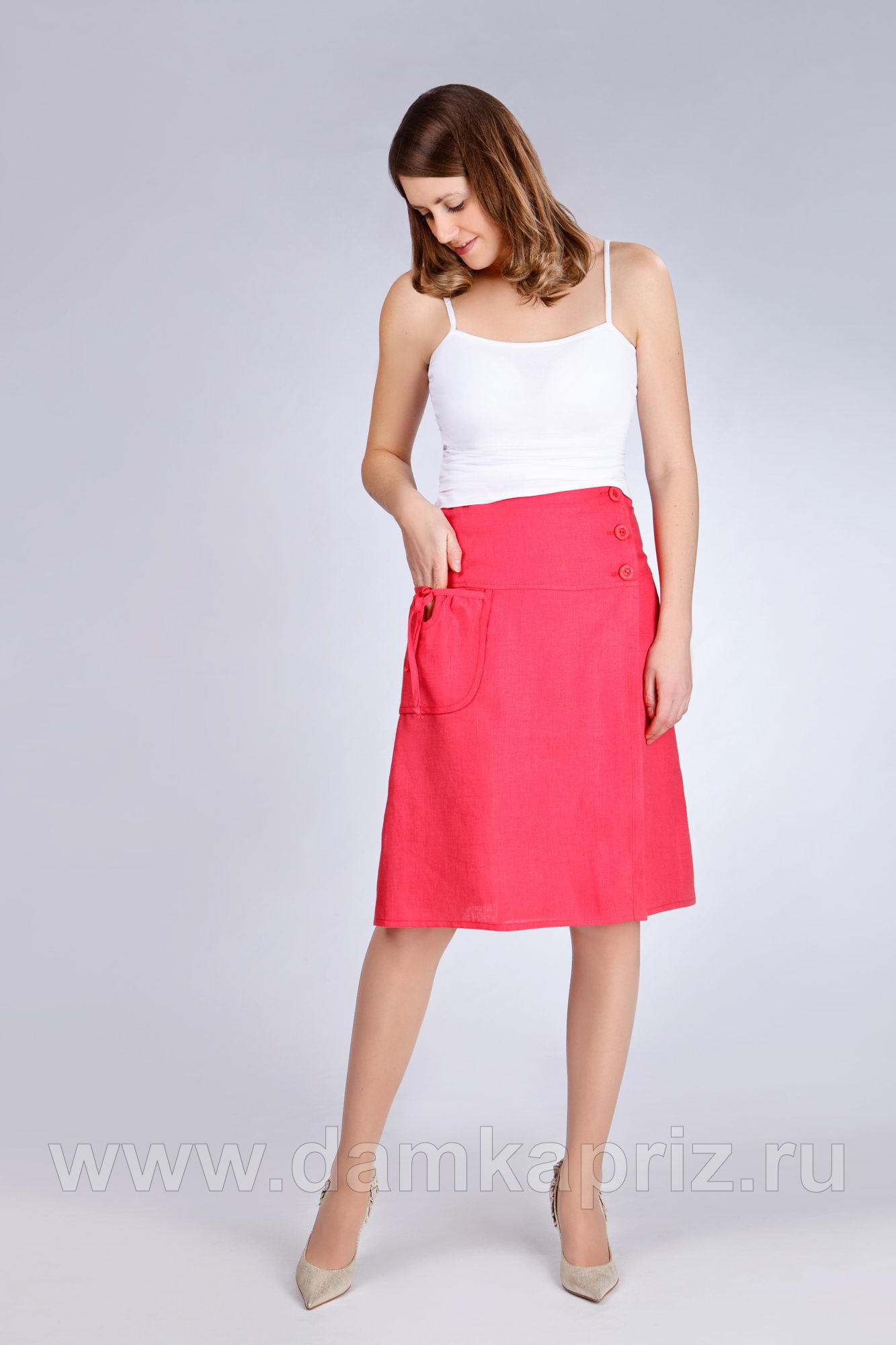 Юбка силуэта "трапеция" выполнена с запахом. Пояс на резинке, застежка на 3 пуговицы (до уровня кокетки). На правой части переда юбки выполнен карман. Низ изделия обработан с боковыми разрезами.
