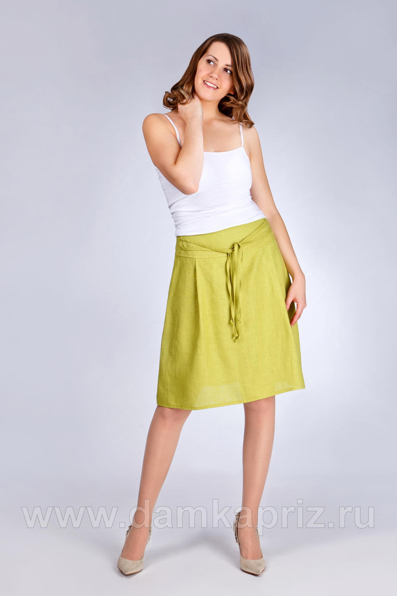 Юбка расклешенного силуэта выполнена с кокетками по линии бедер и мягкими складками. Верхний срез обработан обтачками. Кокетка переда украшена завязками. Молния в левом боковом шве.