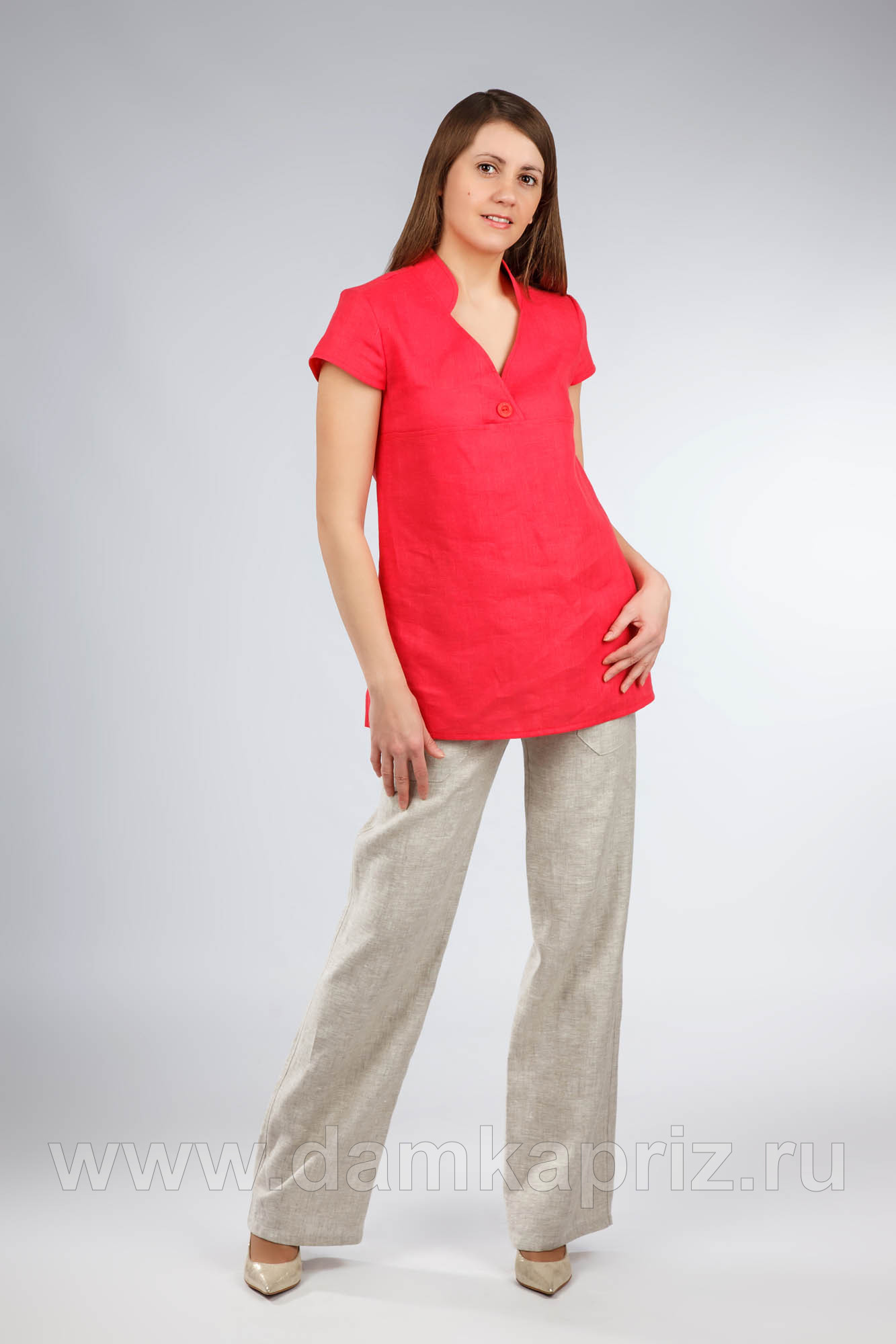 Туника прямого силуэта с коротким рукавом. "V"-образный вырез с воротником-стойкой. На полочке выполнена кокетка по линии груди с декоративной пуговицей. Низ изделия выполнен с боковыми разрезами.