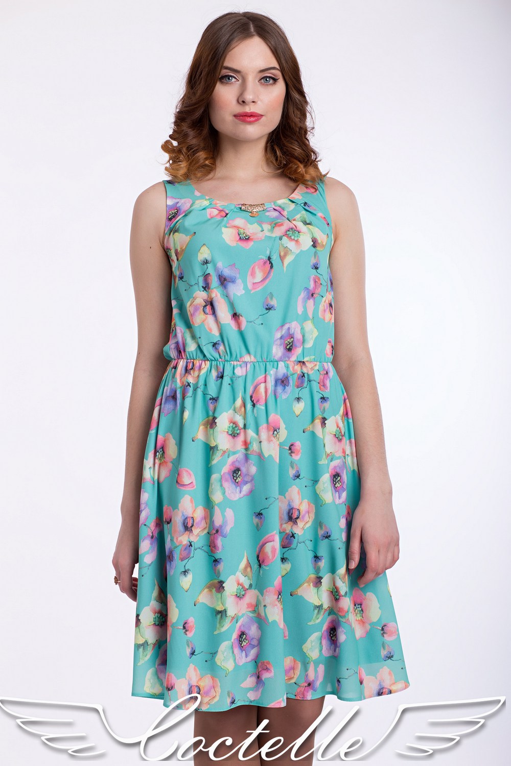 Нежное платье в цветах с золтой подвеской на горловине