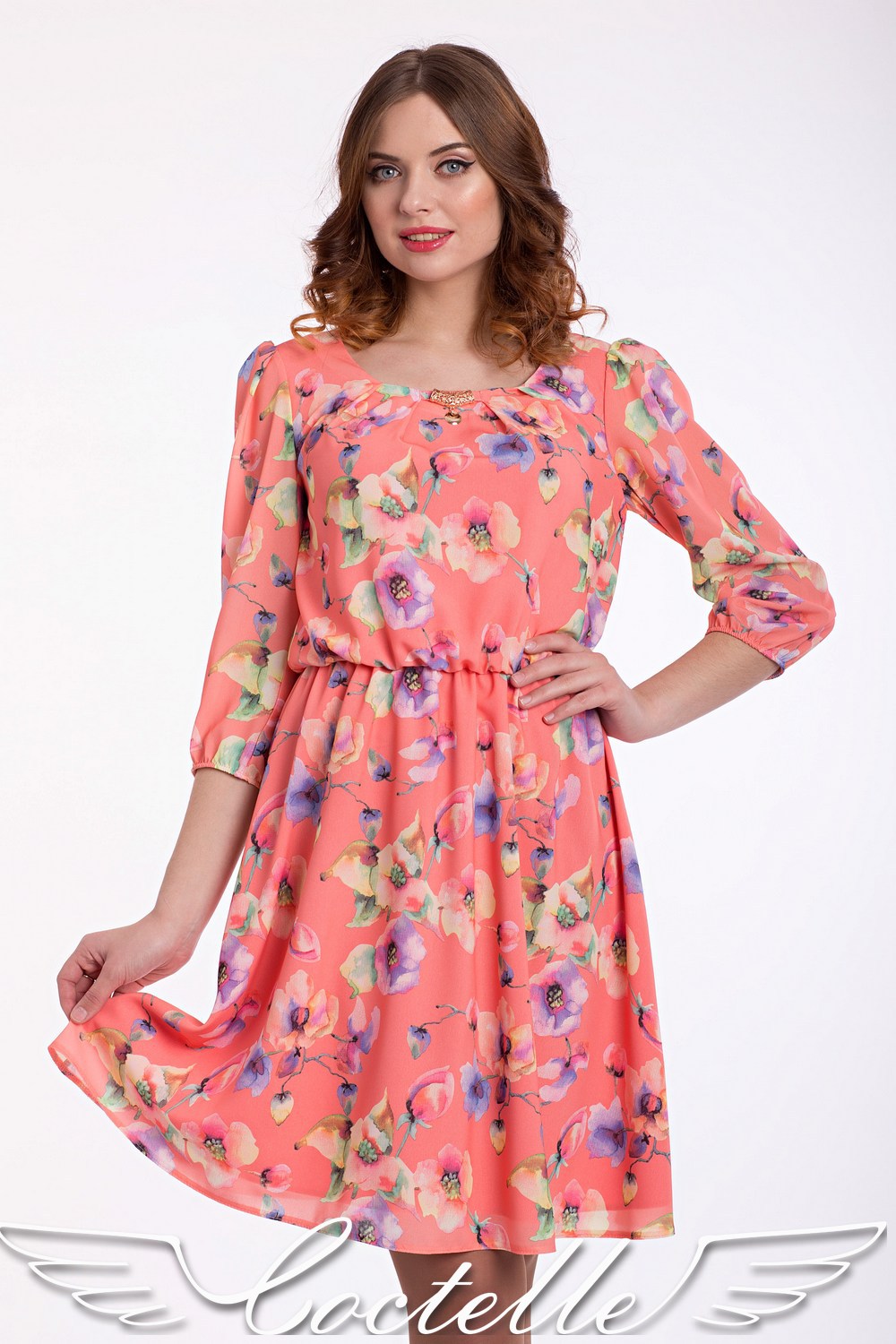 Нежное платье в цветах с золтой подвеской на горловине